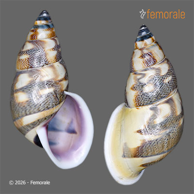 Family: BULIMULIDAEDescription: F++, GORGEOUS SMOOTH AND POLISH SPECIES! WITH IRREGULAR BROWN ORNAMENTED BANDS! BREURE & BORREGO CONSIDER WRONGLY AS SYNONYM OF D.FELIX - IT SEEMS THEY NEVER SAW THIS SPECIES! IT IS THE ONLY SPECIES HAS BLACK APEX AND FIRST WHORLS!