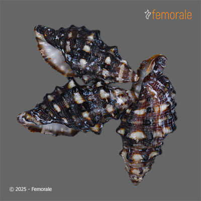 Family: MURICIDAE | Description: F+, UNCOMMON! NODULOSE BLACK WITH WHITE MARKINGS! SPECIAL SET OF THREE NICE SPECIMENS FROM DOUG SNOOK COLLECTION! | Id Shell: 376754 | Location: Mexico West | Size: 18mm up | Price: $12.00 |